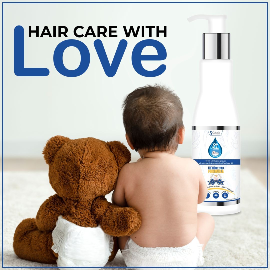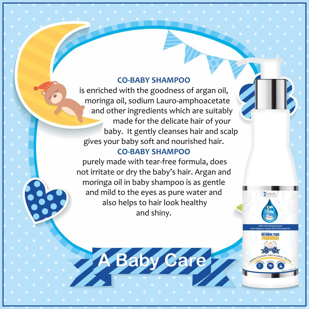 Your baby's scalp loses moisture 5 times faster after every bath and hence needs special care. Suitably made for the delicate hair & scalp of your baby, "Co-Baby Shampoo” is infused with the deep nourishment of Argan & Moringa Oil which gently yet effectively cleanse & freshens your baby's head, helps to moisturize the dry scalp, strengthens the baby's hair, promotes hair growth & makes your baby’s hair soft and shiny. It lathers into a thick, soft & instant foam to ensure a quick & efficient bath effortlessly. It is as gentle as water, non-irritating to your baby's sensitive eyes, and non-drying for the scalp. Best baby shampoo keeps the scalp cool and maintains its pH balance. Hypoallergenic & dermatologically tested, this mild cleanser for newborn babies & kids is free from toxins & harmful chemicals, making it completely safe to be used on your baby's delicate skin.