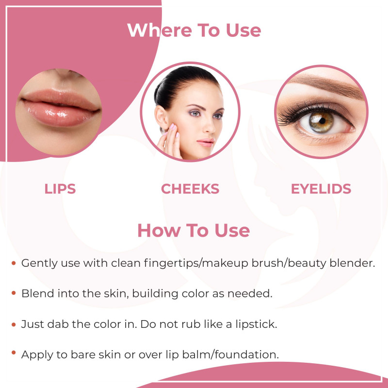 For eyelids: Just take a generous amount of our multi pot on your finger and gently apply a layer on your eyelids. Now blend to your desired need.