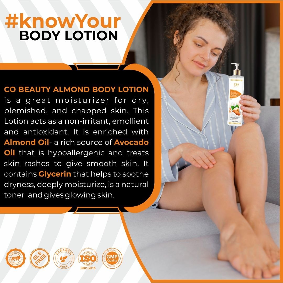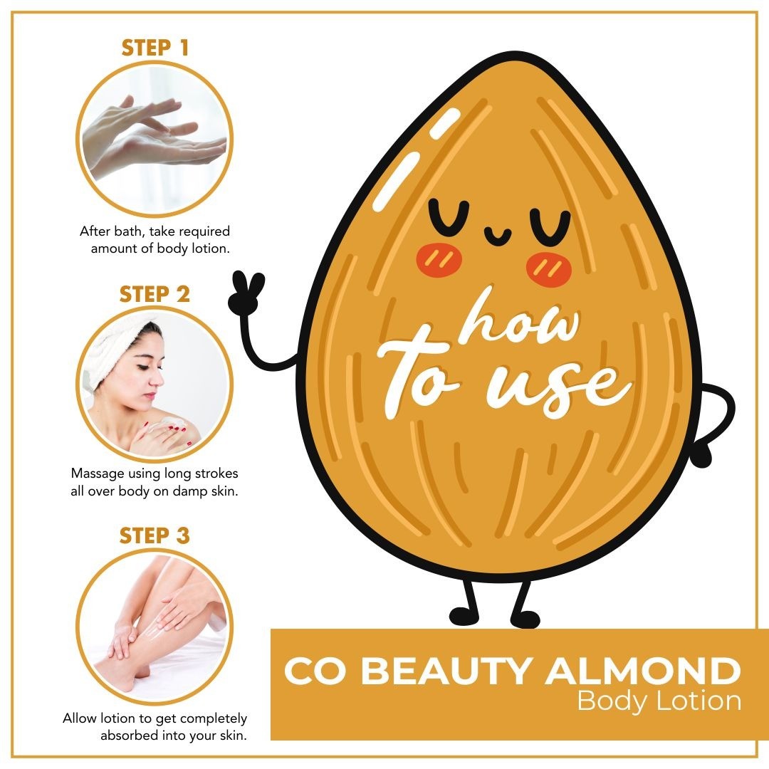 Daily moisturization with the right products is the best defense against dry & lifeless skin. Get Silky, Soft & Healthy looking skin with this luxuriously rich body lotion. Infused with the deep moisturization of perfect emollients & natural oils, Co-Beauty Almond Body Lotion has been specially created to meet the daily nourishment needs of your skin. The milky smooth texture of this nourishing Body lotion easily spreads over & deeply hydrates the skin along with locking the moisture for a longer duration. Suitable for Normal to Combination skin, this Body lotion is perfect for daily use in all seasons. Enjoy the deep moisturization of a rich, gentle skincare lotion that is mild, comfortable, non-drying, and non-irritating to your skin.