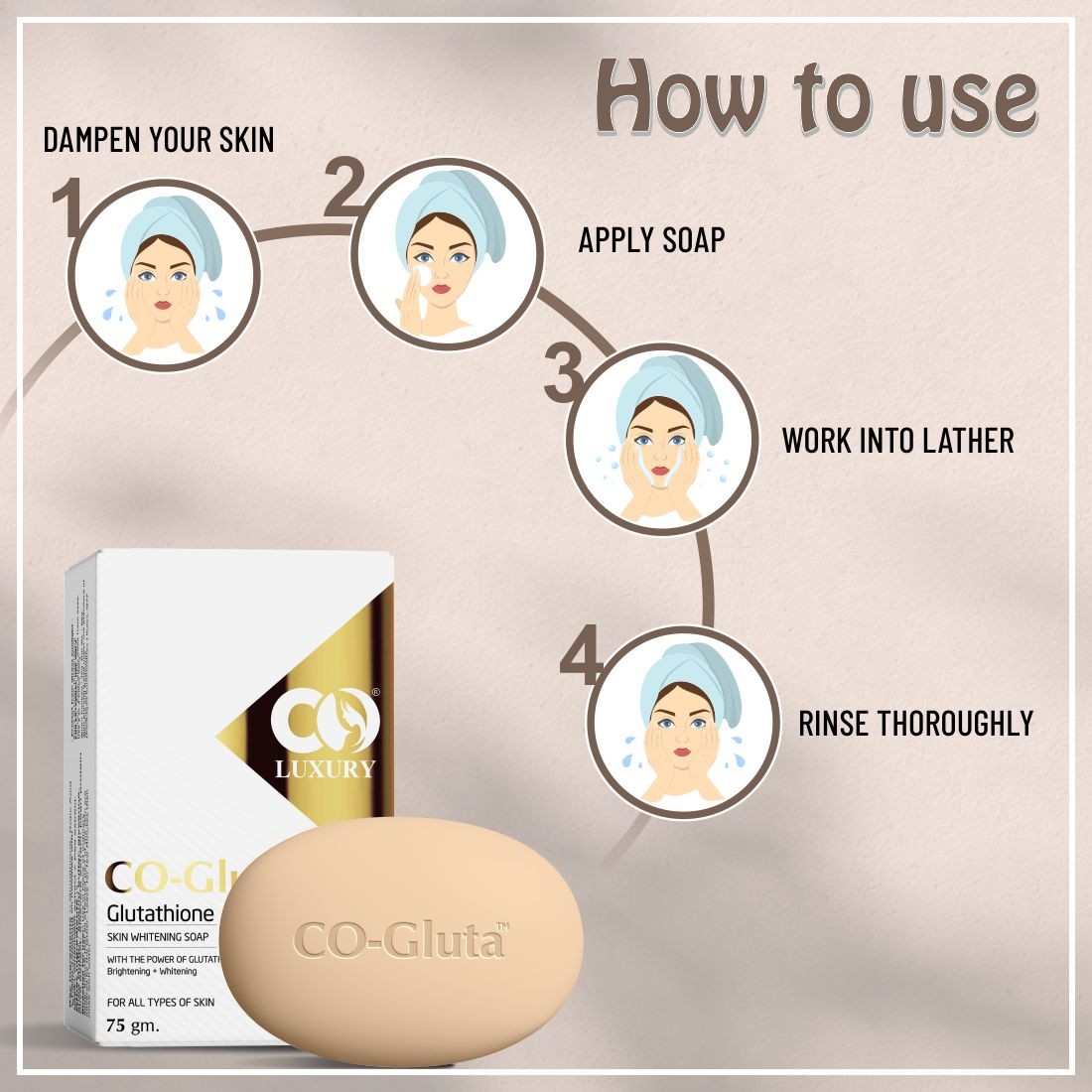 Step 2 - Use glutathione soap in place of ordinary soap and facewash. Gently massage and work out to rich lather.