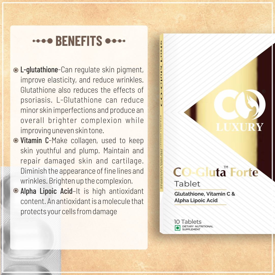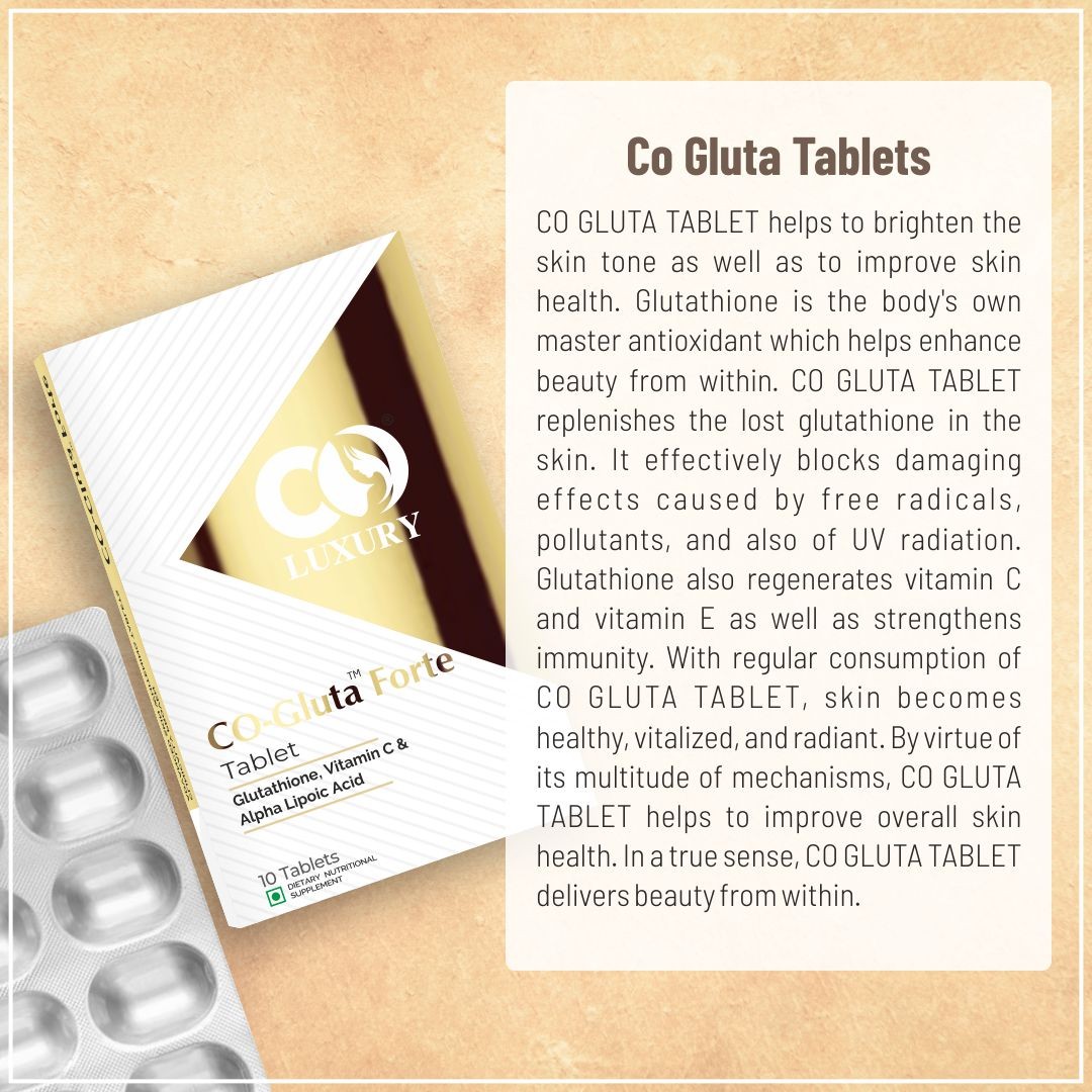 Co Company’s Co-Luxury Gluta Tablet is an antioxidant-rich supplement combining the powerhouse ingredients - L-glutathione, Alpha Lipoic Acid, and Vitamin C which work at the cellular level to promote skin whitening, anti-aging & overall wellbeing of your body. Glutathione's efficacy in skin lightening works only if it is taken with Vitamin C. The additional power of Vitamin C and Alpha Lipoic Acid in these tablets helps in fighting free radicals, protects the body from their damaging effects & reduces oxidative stress which plays a key role in the aging & skin dullness process. Whether it is skin discolorations or chronic diseases like Diabetes and Heart Disease, this Natural Skin Brightening Supplement brings countless benefits to your skin & health. Our superior formula is made from powerful natural ingredients only and is proven to provide fast and lasting results. No harmful chemicals included!