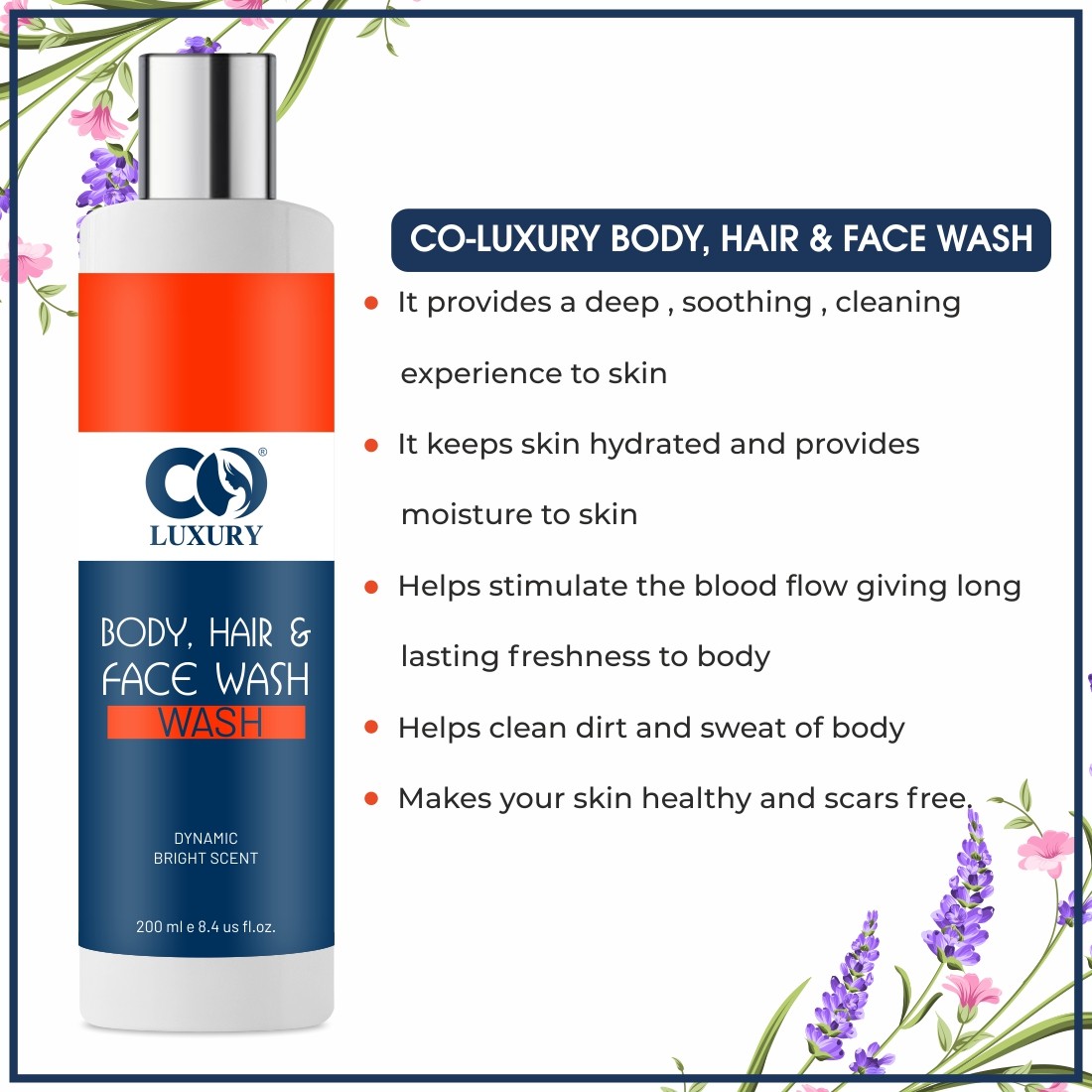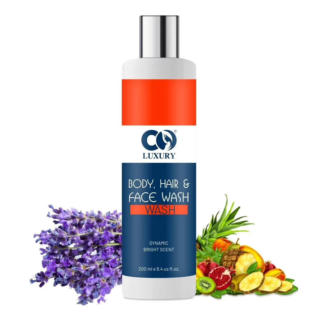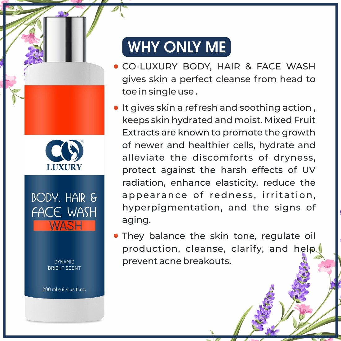 Infused with the richness of Lavender Essential Oil, Mix Fruit extract, Rosehip Essential Oil, Hyaluronic Acid & a Dynamic Bright Scent, this 3-in-1 magical liquid is all you need for a perfect head to toe wash. Co-Luxury All-in-1 Body, Hair & Face Wash is a uniquely blended unisex product that gives your Body, Face & Hair a perfect cleanse & refreshes you in single-use. Completely safe for all skin/hair types in all weather conditions, this non-drying & non-irritating Liquid Wash gently pulls out the deep-seated dirt, environmental toxins & impurities along with absorbing excess oil, clearing clogged pores but moisturizing at the same time.