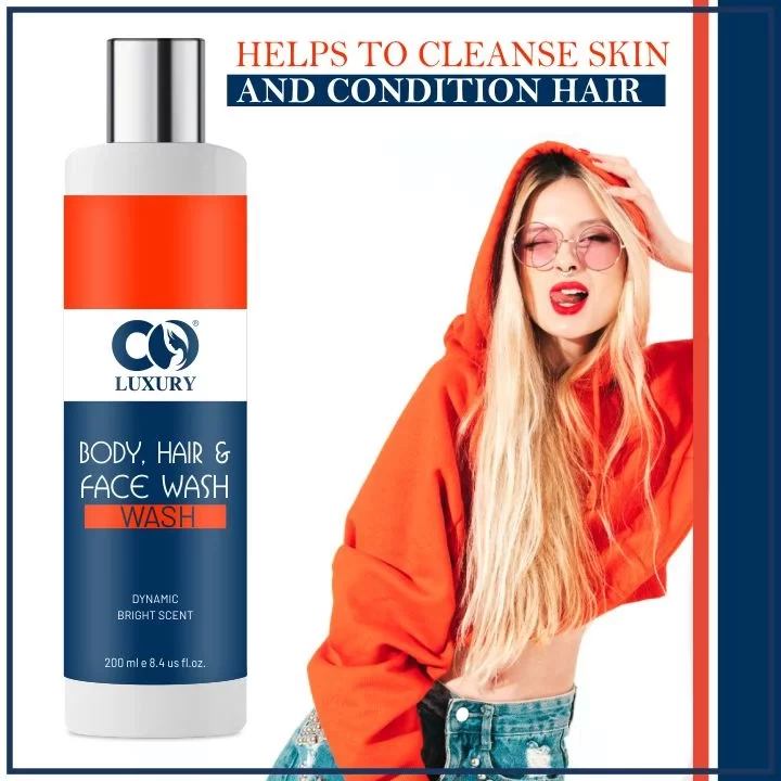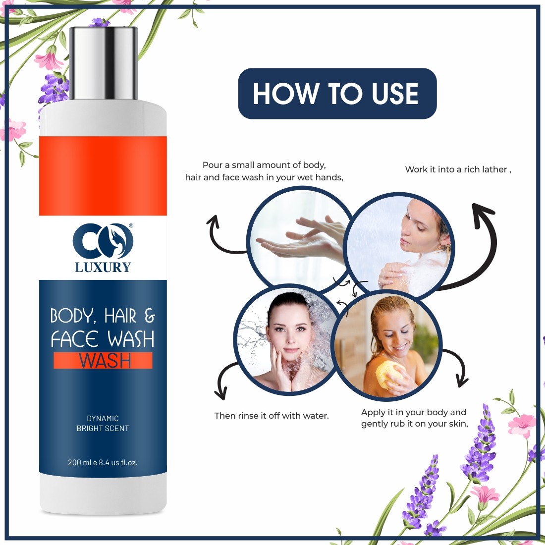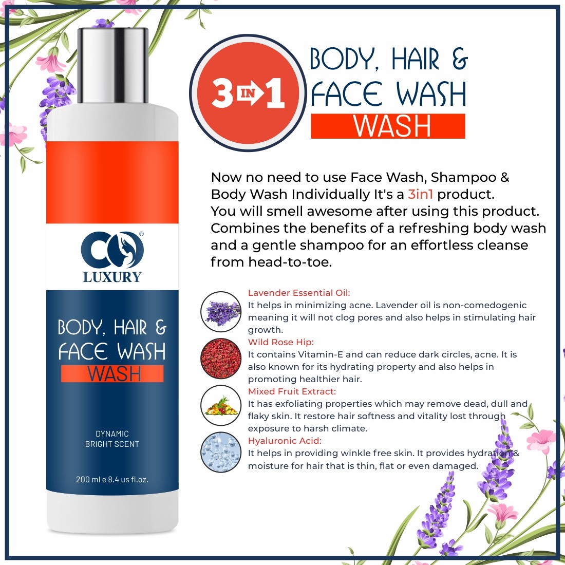 Infused with the richness of Lavender Essential Oil, Mix Fruit extract, Rosehip Essential Oil, Hyaluronic Acid & a Dynamic Bright Scent, this 3-in-1 magical liquid is all you need for a perfect head to toe wash. Co-Luxury All-in-1 Body, Hair & Face Wash is a uniquely blended unisex product that gives your Body, Face & Hair a perfect cleanse & refreshes you in single-use. Completely safe for all skin/hair types in all weather conditions, this non-drying & non-irritating Liquid Wash gently pulls out the deep-seated dirt, environmental toxins & impurities along with absorbing excess oil, clearing clogged pores but moisturizing at the same time.