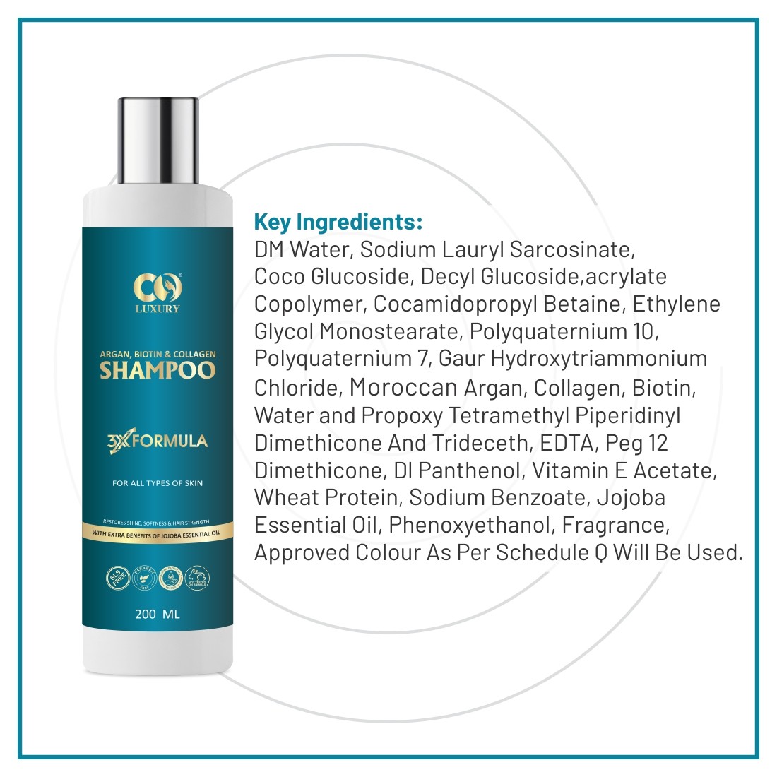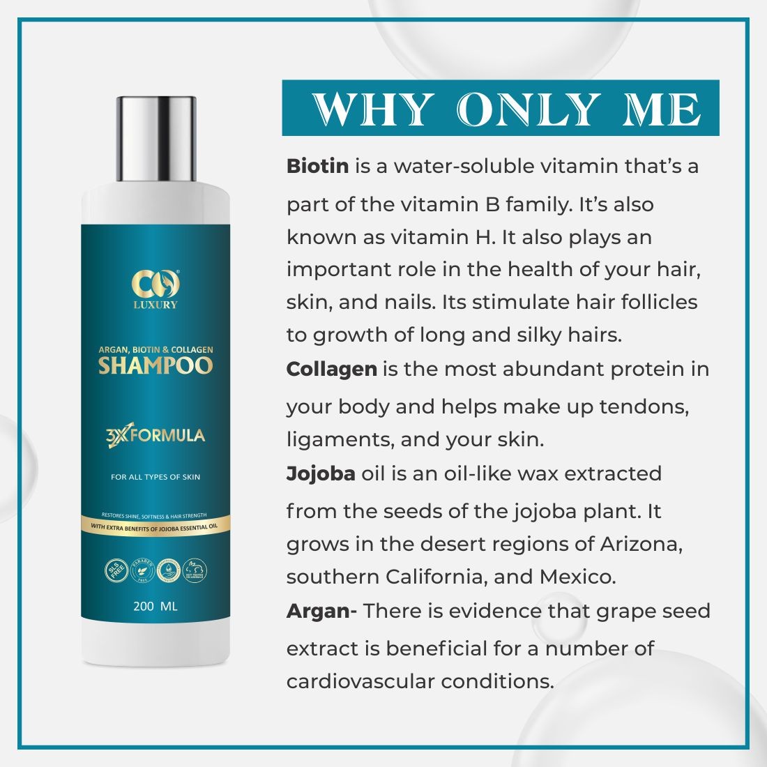 Enriched with the deep nourishment of Argan Oil, Biotin, Collagen, and the additional benefits of Jojoba Oil, this Volumizing Keratin-rich shampoo is all you need for advanced hair nourishment regimen. Extracted from Morocco’s argan trees, argan oil is also called ‘liquid gold’ due to the wide range of benefits it offers, whereas Biotin and Collagen stimulate Keratin production, & Jojoba oil hydrates individual hair strand helps lock in the moisture & also protect hair from styling tool-induced heat damage. Completely safe for colored or chemically-treated hair, this non-drying & non-irritating, the chemical-free shampoo gently pulls out the deep-seated dirt, environmental toxins & impurities along with absorbing excess oil from the scalp & clears clogged pores. The wealth of hair-replenishing ingredients in Co-Luxury Aragan, Biotin & Collagen shampoo penetrates the hair fiber from root to tip & creates texture from within to generate a thicker feel, root lift, and lasting volume over time.