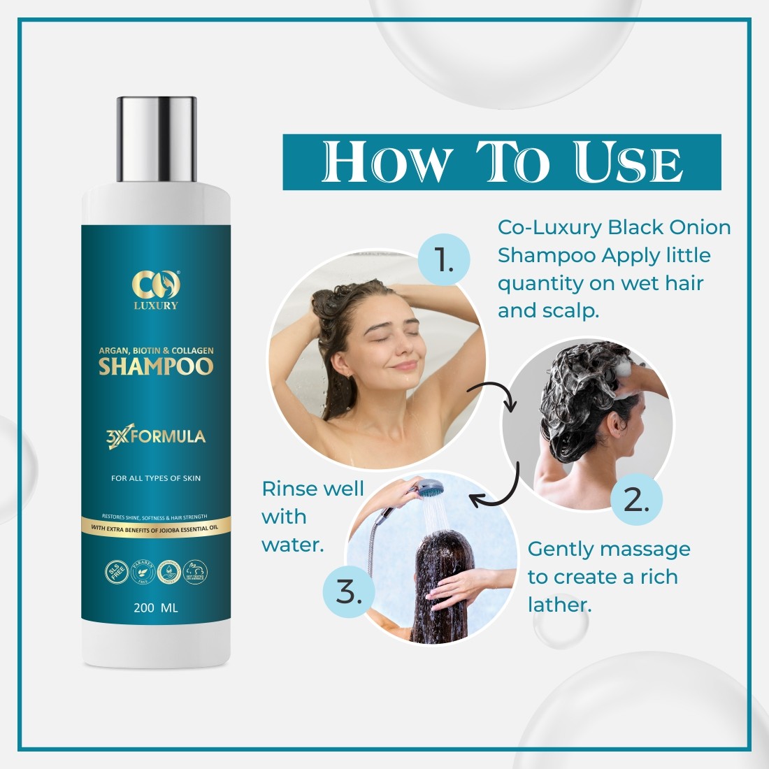 Step 2 - Take an adequate amount Co-Luxury Aragan, Biotin & Collagen shampoo in your wet hands and gently massage over your scalp using fingertips few minutes.