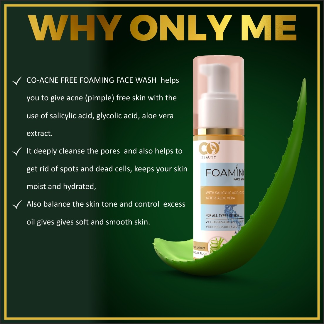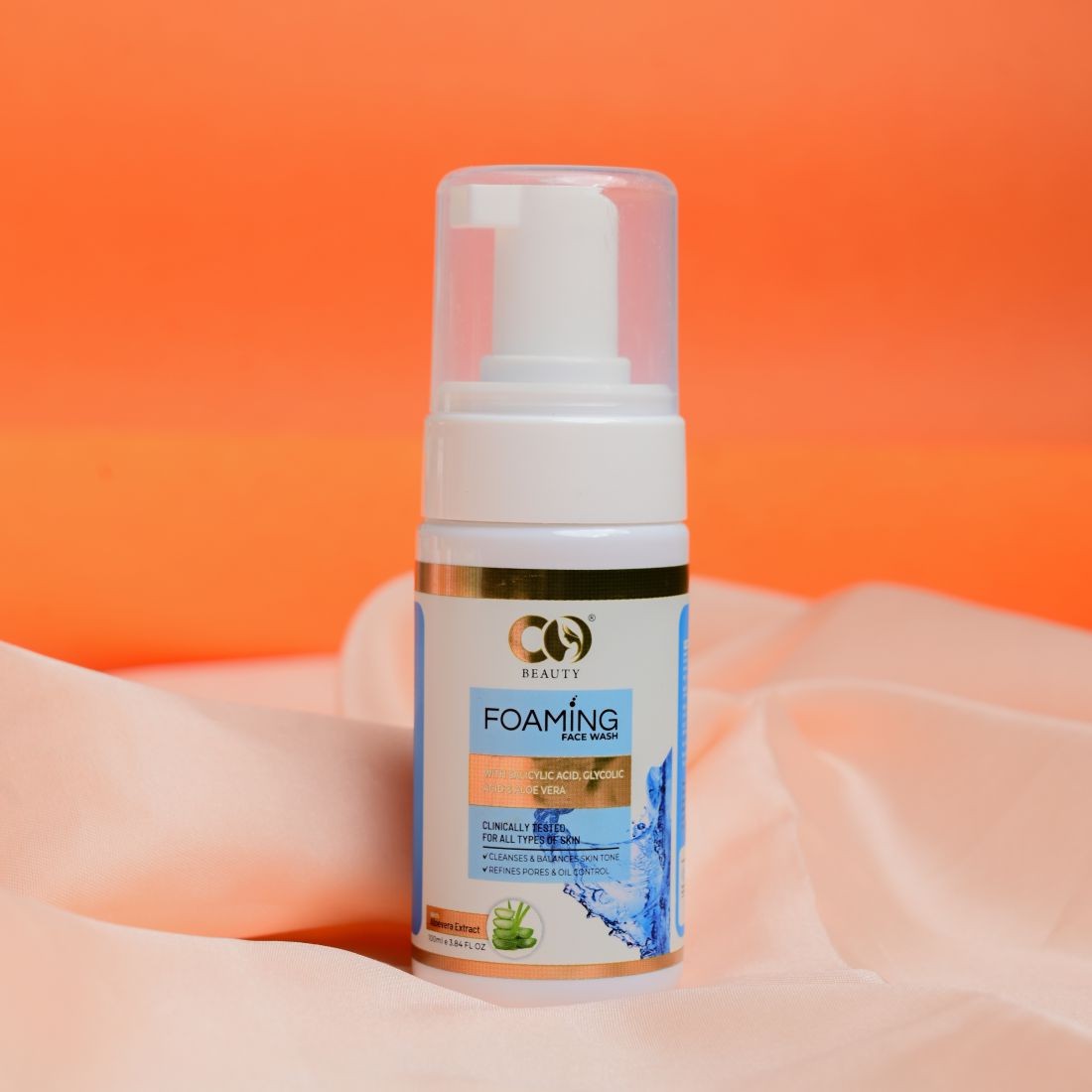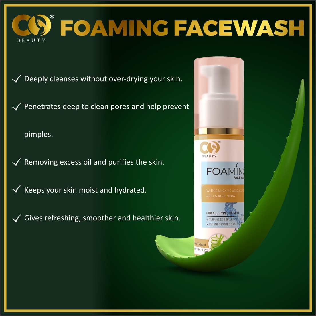 Keep those stubborn & painful acne at bay and vanish those harsh toxins and impurities from the deep layers of your skin with Co-Beauty FOAMING FACE WASH that has supreme exfoliators - Salicylic acid & Glycolic acid which not only prevent clogged pores, acne, diminishes the appearance of blackheads and whiteheads, but also moisturizes at the same time, giving you a well-nourished, clear complexion. The additional benefits of Aloe Vera offer cooling & anti-inflammatory properties, which boost the healing process of damaged skin and keep your skin hydrated along with maintaining the pH balance. Its gentle yet powerful soap-free formula not only removes deep-seated impurities & tanning but also protects the skin from pollution & harsh environmental damage, making it perfect for daily use in all seasons.